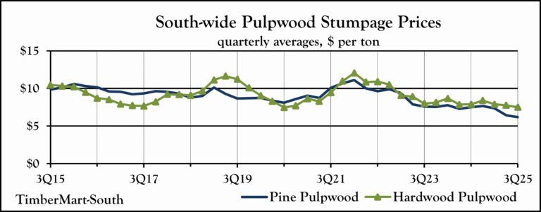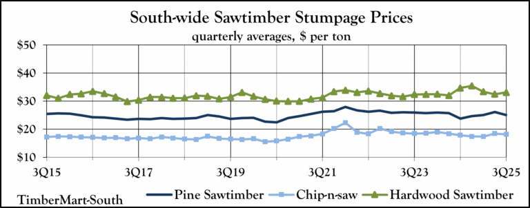 TimberMart-South (TMS) collects market data from a broad cross section of the timber industry. Our reporters, both companies and individuals, are actively engaged in the day-to-day operation of selling and buying timber on the stump and delivering to yards and mills. From these reports, over each quarter, these data are sorted and tabulated to arrive at a grouping of price ranges, low and high. From these groupings, a simple average is obtained for each state, area, and product.