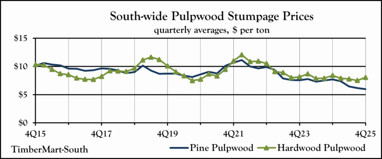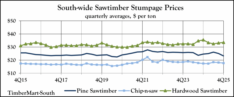 TimberMart-South (TMS) collects market data from a broad cross section of the timber industry. Our reporters, both companies and individuals, are actively engaged in the day-to-day operation of selling and buying timber on the stump and delivering to yards and mills. From these reports, over each quarter, these data are sorted and tabulated to arrive at a grouping of price ranges, low and high. From these groupings, a simple average is obtained for each state, area, and product.