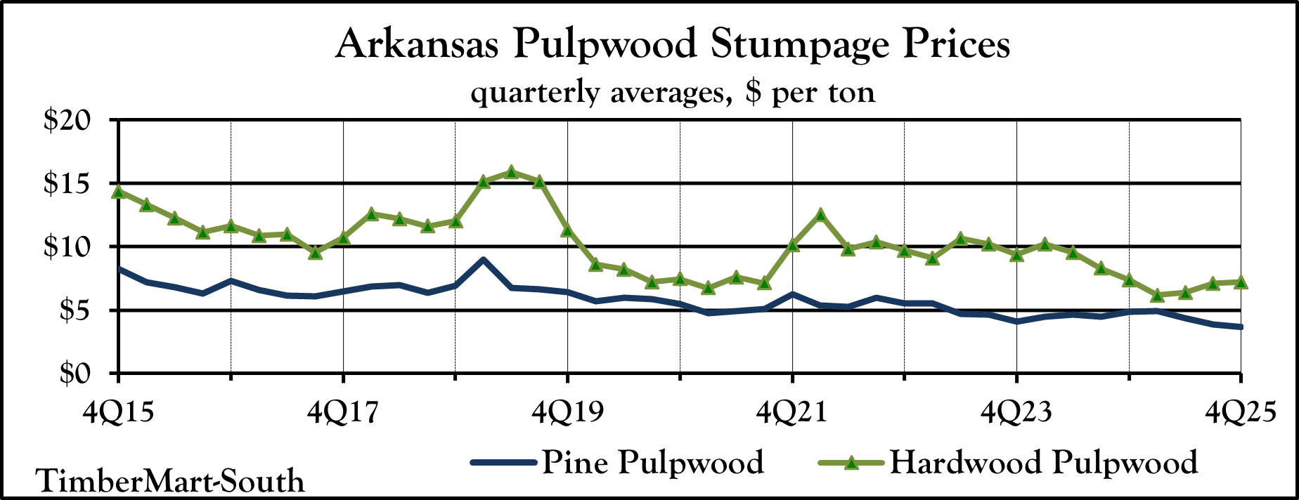 TimberMart-South (TMS) collects market data from a broad cross section of the timber industry. Our reporters, both companies and individuals, are actively engaged in the day-to-day operation of selling and buying timber on the stump and delivering to yards and mills. From these reports, over each quarter, these data are sorted and tabulated to arrive at a grouping of price ranges, low and high. From these groupings, a simple average is obtained for each state, area, and product.