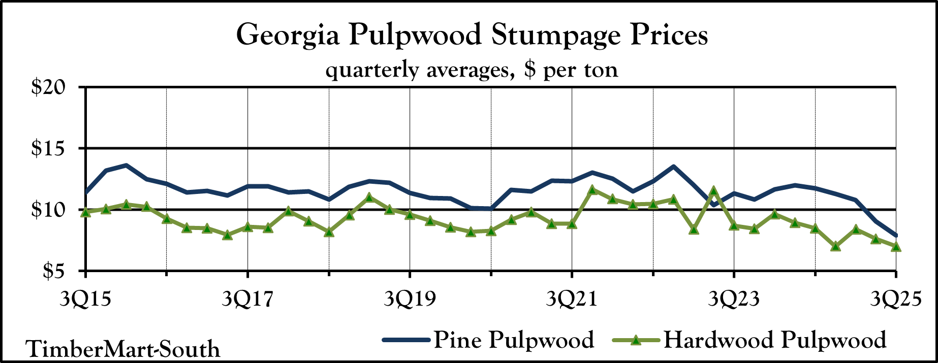 TimberMart-South (TMS) collects market data from a broad cross section of the timber industry. Our reporters, both companies and individuals, are actively engaged in the day-to-day operation of selling and buying timber on the stump and delivering to yards and mills. From these reports, over each quarter, these data are sorted and tabulated to arrive at a grouping of price ranges, low and high. From these groupings, a simple average is obtained for each state, area, and product.