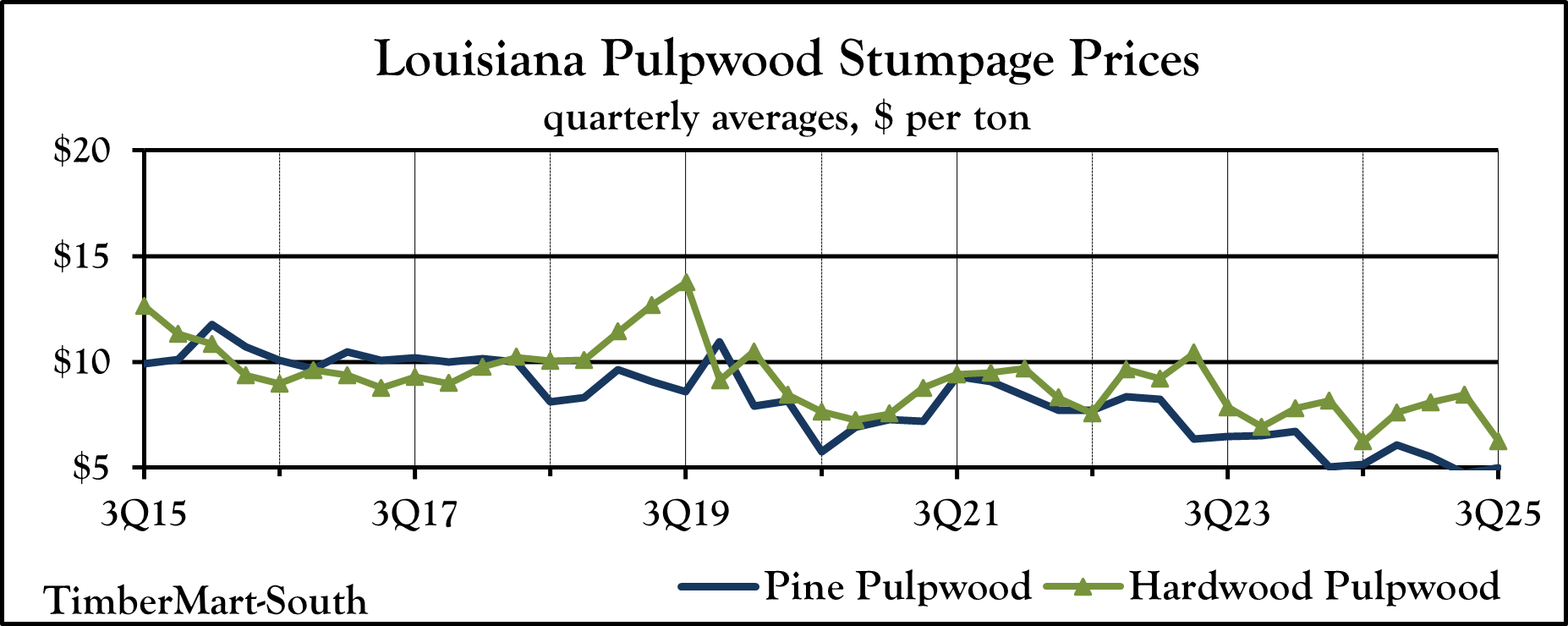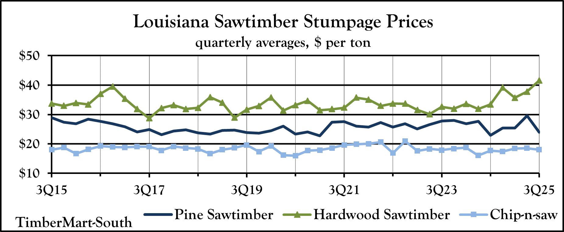 TimberMart-South (TMS) collects market data from a broad cross section of the timber industry. Our reporters, both companies and individuals, are actively engaged in the day-to-day operation of selling and buying timber on the stump and delivering to yards and mills. From these reports, over each quarter, these data are sorted and tabulated to arrive at a grouping of price ranges, low and high. From these groupings, a simple average is obtained for each state, area, and product.