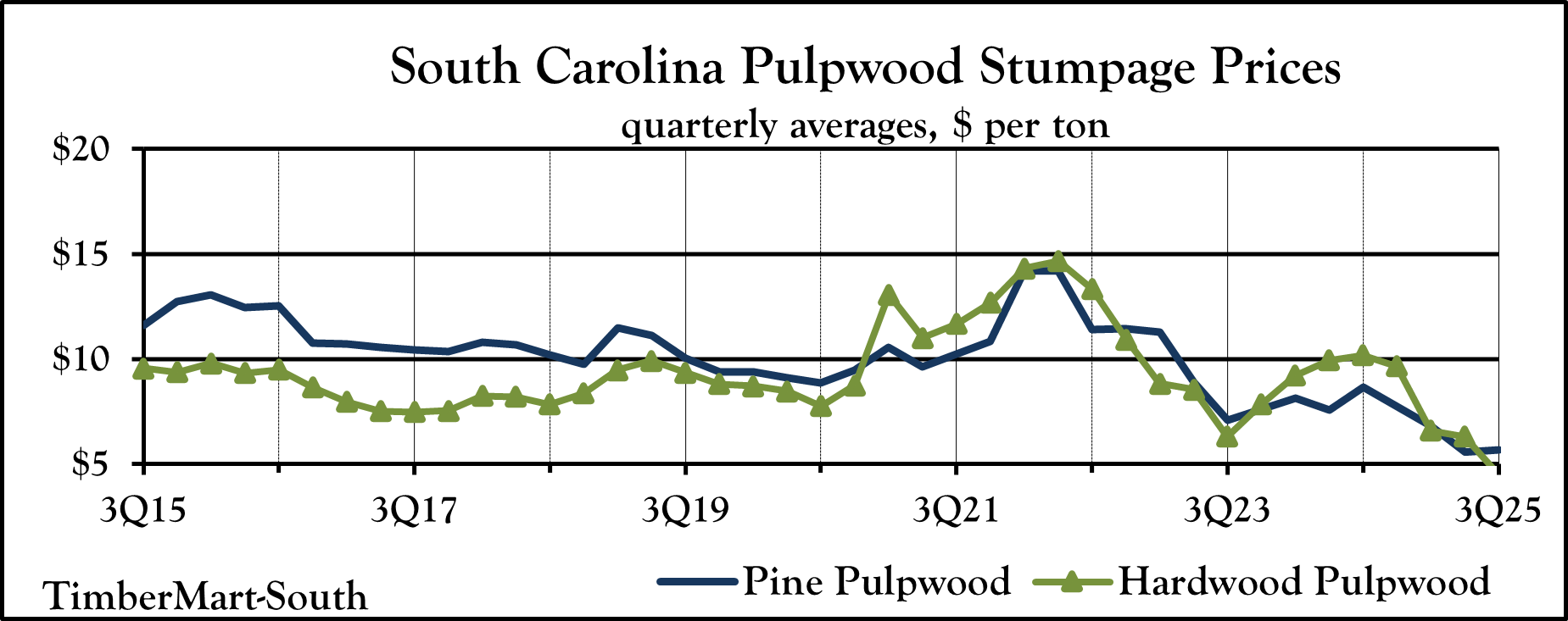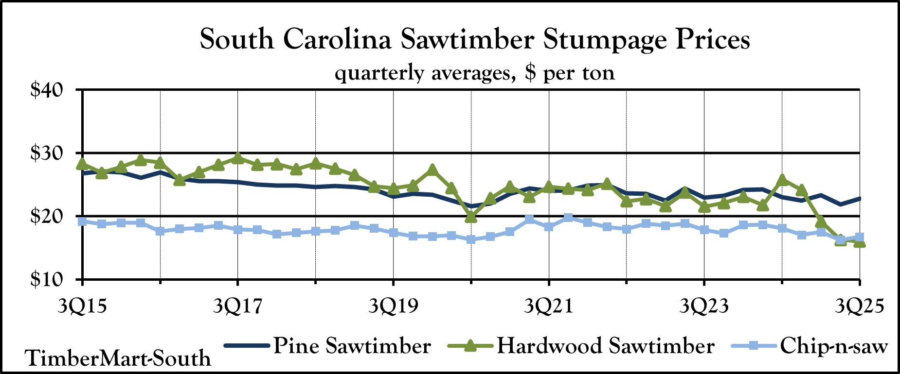 TimberMart-South (TMS) collects market data from a broad cross section of the timber industry. Our reporters, both companies and individuals, are actively engaged in the day-to-day operation of selling and buying timber on the stump and delivering to yards and mills. From these reports, over each quarter, these data are sorted and tabulated to arrive at a grouping of price ranges, low and high. From these groupings, a simple average is obtained for each state, area, and product.