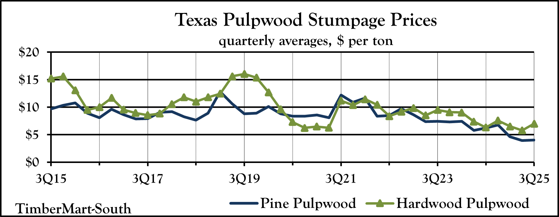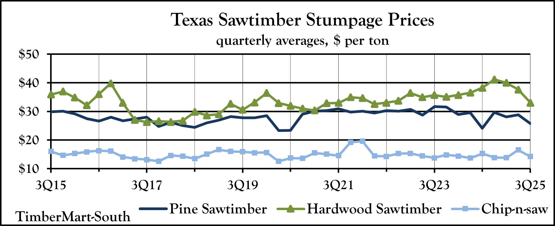 TimberMart-South (TMS) collects market data from a broad cross section of the timber industry. Our reporters, both companies and individuals, are actively engaged in the day-to-day operation of selling and buying timber on the stump and delivering to yards and mills. From these reports, over each quarter, these data are sorted and tabulated to arrive at a grouping of price ranges, low and high. From these groupings, a simple average is obtained for each state, area, and product.