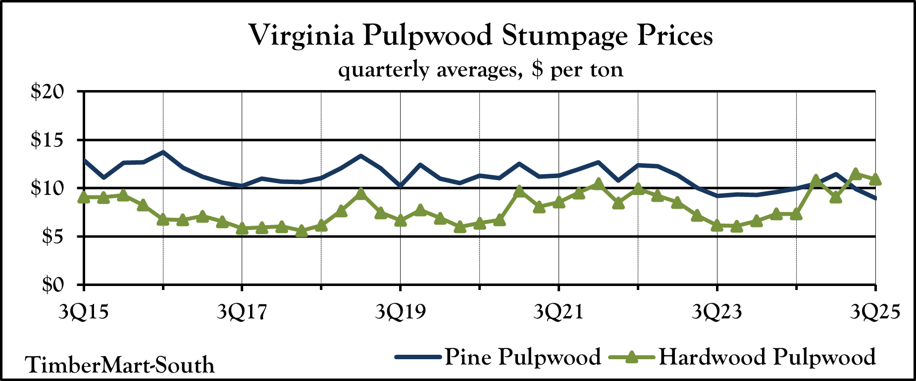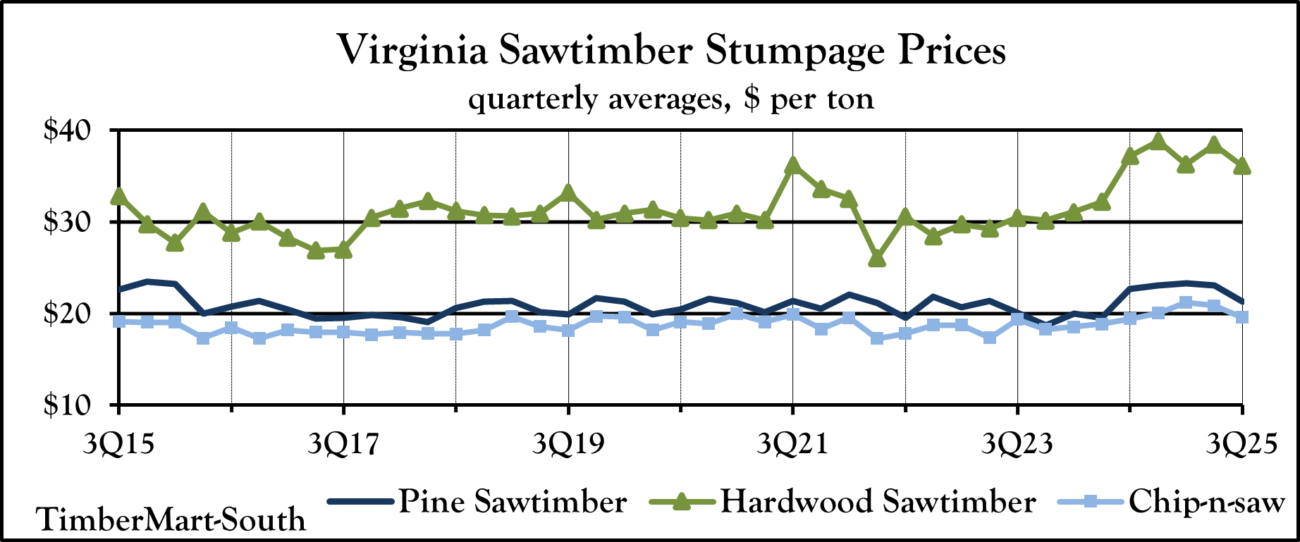 TimberMart-South (TMS) collects market data from a broad cross section of the timber industry. Our reporters, both companies and individuals, are actively engaged in the day-to-day operation of selling and buying timber on the stump and delivering to yards and mills. From these reports, over each quarter, these data are sorted and tabulated to arrive at a grouping of price ranges, low and high. From these groupings, a simple average is obtained for each state, area, and product.